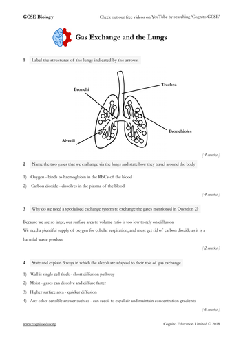 Gcse Biology 9 1 Gas Exchange And The Lungs Worksheet Teaching Resources